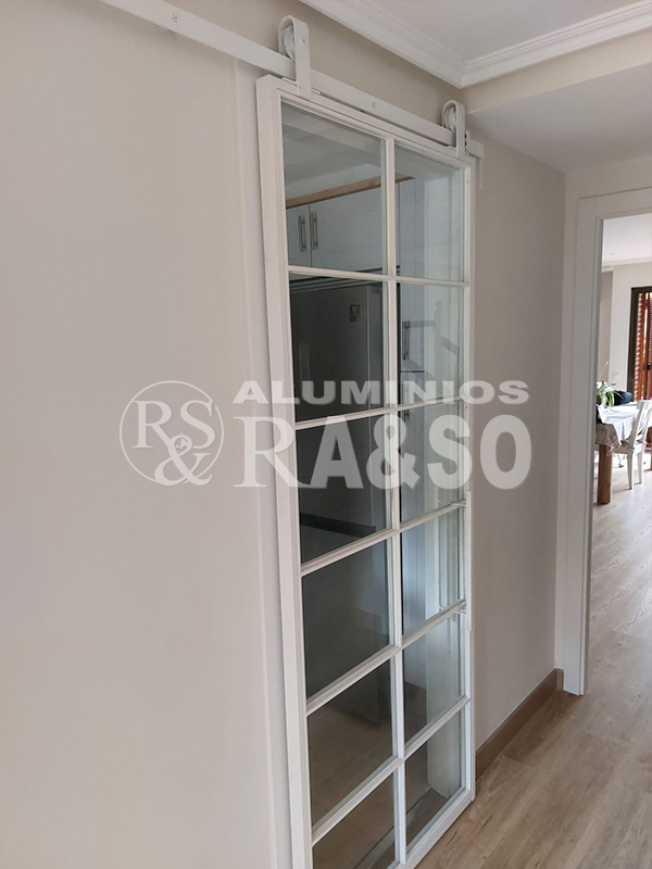 Este cerramiento de interior cuenta con un sistema de corredera vista tipo granero, ideal para optimizar el espacio y facilitar el paso entre zonas como cocina, pasillo o comedor. El vidrio permite el paso de la luz natural, mejorando la conexión entre estancias sin perder funcionalidad.