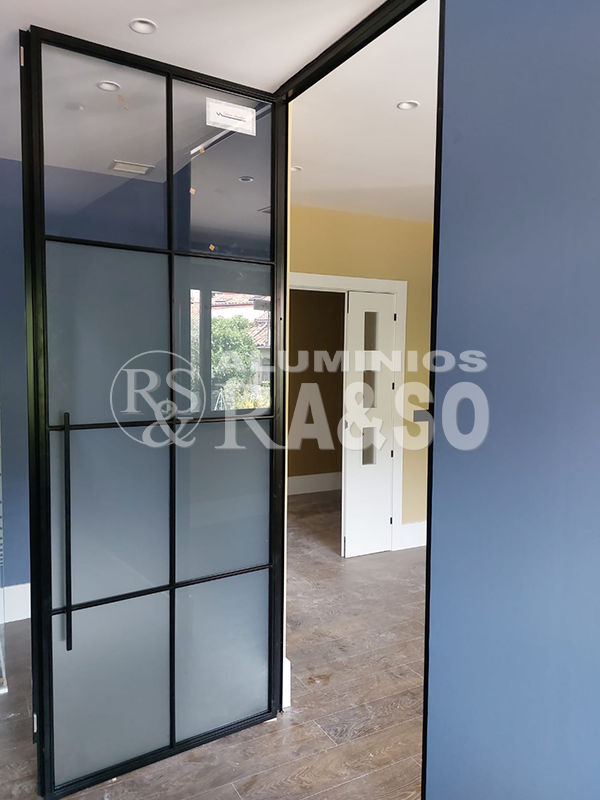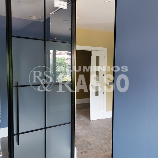 En este proyecto se llevó a cabo la fabricación e instalación de un cerramiento de interior de aluminio y vidrio con puerta abatible, diseñado para separar estancias manteniendo la continuidad visual y la entrada de luz natural. La perfilería de aluminio en acabado negro y el diseño con cuarterones aportan un marcado estilo industrial y contemporáneo.