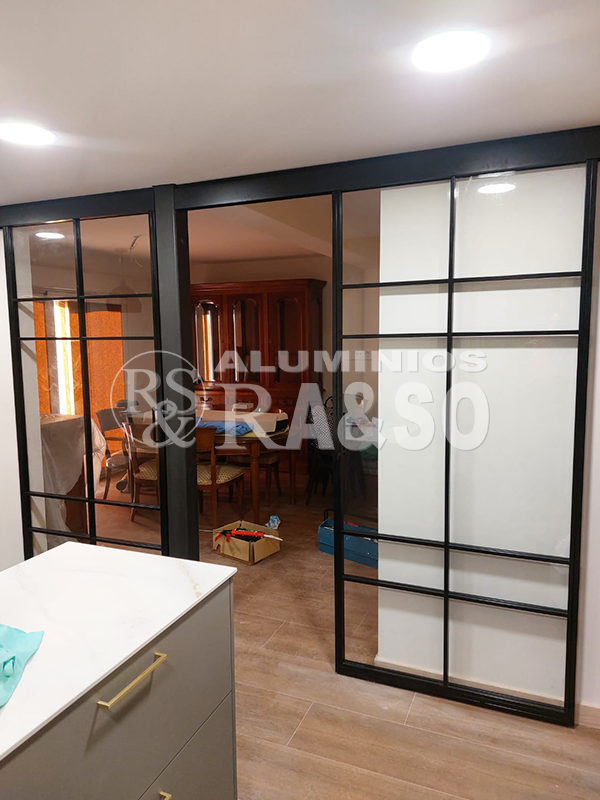 En este proyecto se llevó a cabo la fabricación e instalación de un cerramiento de interior de aluminio y vidrio con sistema de puertas correderas, pensado para separar la cocina del comedor de forma práctica y elegante. La perfilería de aluminio en acabado negro y el diseño con cuarterones refuerzan un estilo industrial moderno y muy actual.