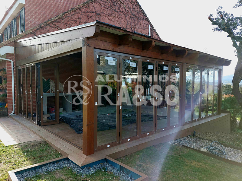 El cerramiento cuenta con hojas de cristal que permiten una apertura amplia, aportando versatilidad y una excelente integración con el entorno ajardinado. El diseño respeta la estética de la vivienda, logrando un resultado elegante, funcional y perfectamente armonizado con la arquitectura existente.