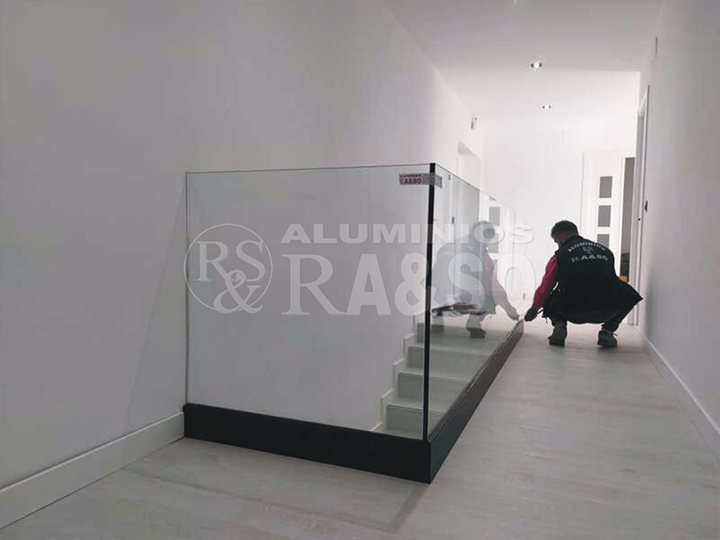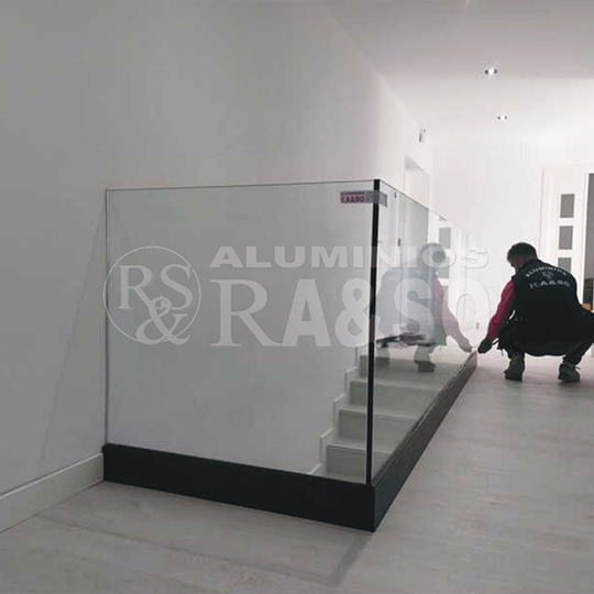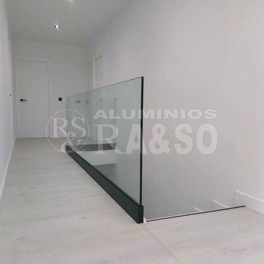 Se utilizó vidrio templado de alta resistencia que garantiza seguridad y durabilidad, permitiendo además una total transparencia para aprovechar al máximo la luz natural. El perfil inferior de aluminio negro lacado aporta un acabado elegante y actual, combinando diseño y funcionalidad en un mismo elemento.