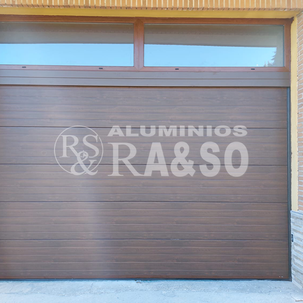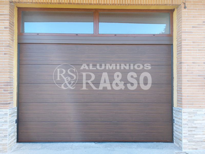 Puerta de garaje seccional de aluminio con acabado madera y vidrio superior