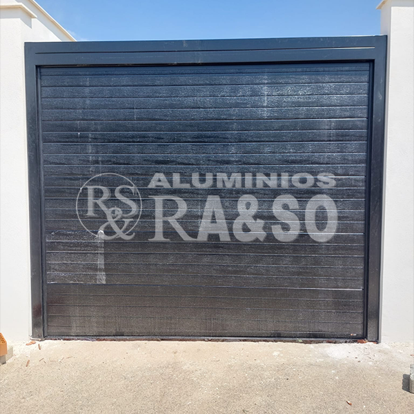 La puerta de aluminio cuenta con un sistema seccional que permite una apertura vertical eficiente, optimizando el espacio y garantizando un uso cómodo y seguro. El panelado horizontal aporta uniformidad visual y refuerza la sensación de robustez y calidad.