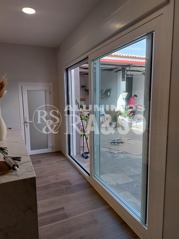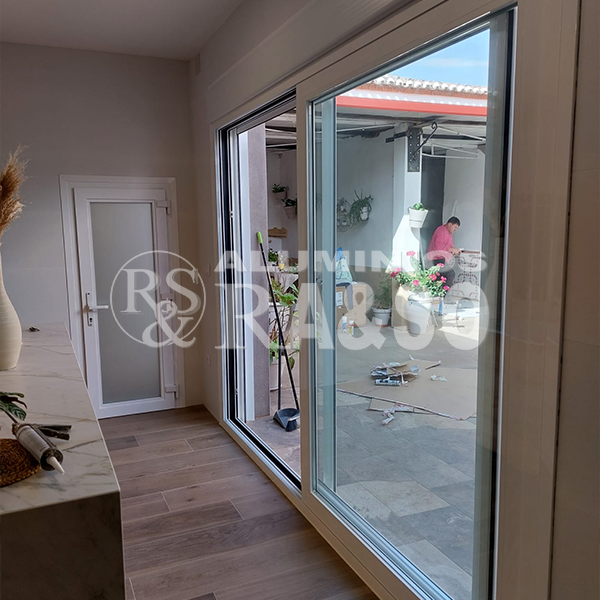 En esta instalación se ha colocado una ventana corredera de aluminio de grandes dimensiones, diseñada para maximizar la entrada de luz natural y mejorar la conexión visual entre el interior de la vivienda y el patio exterior.